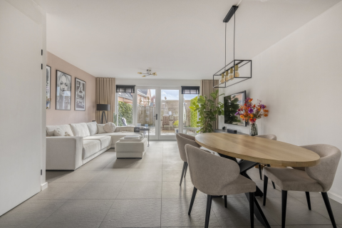 In de achtergevel bevindt zich een schuifpui die toegang geeft tot het overdekte terras. Zet de schuifpui open en maak van de tuin een verlengstuk van de woonkamer, perfect voor zomerse etentjes of om gewoon te genieten van het buitenleven. Deze ruimte biedt jou de kans om jouw persoonlijke stijl en sfeer te creëren, zowel binnen als buiten.