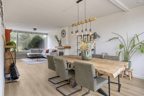 De ruime woonkamer en eetkamer beslaan samen 44,5 m², waardoor je volop mogelijkheden hebt om een comfortabele zithoek te creëren rondom de sfeervolle gashaard. Grote ramen in zowel de voor- als achtergevel zorgen voor een mooie lichtinval, waardoor de ruimte nog groter en lichter aanvoelt. De aangebouwde eetkamer (2,52 m breed en 5,37 m lang) biedt alle ruimte voor een grote tafel – ideaal voor gezellige diners of spelletjesavonden met familie en vrienden.